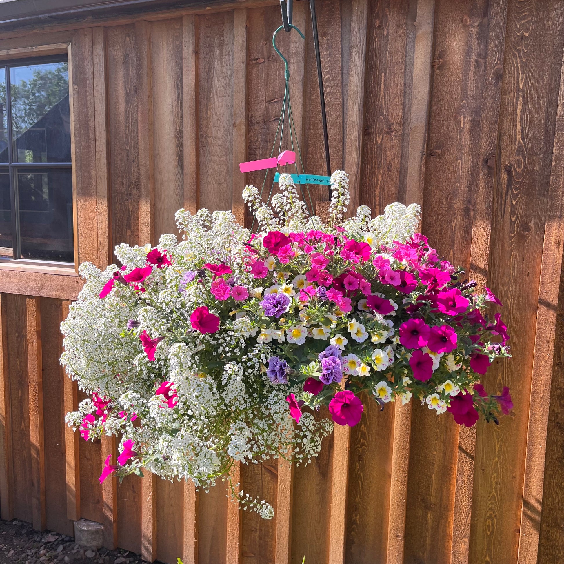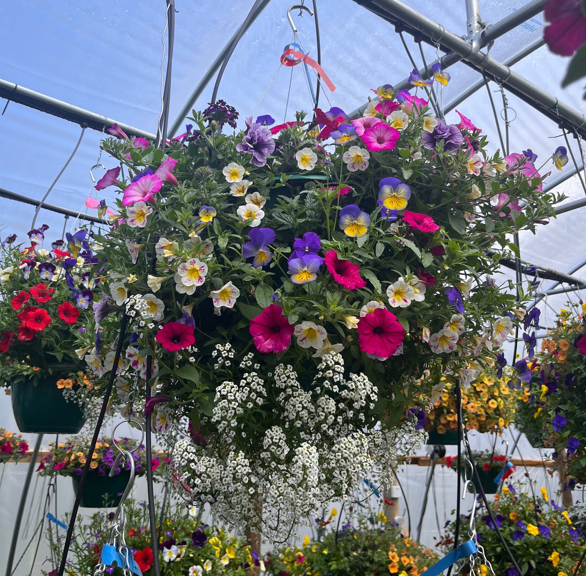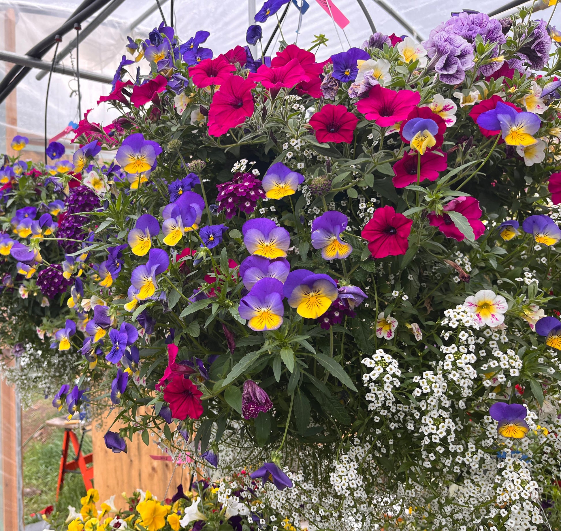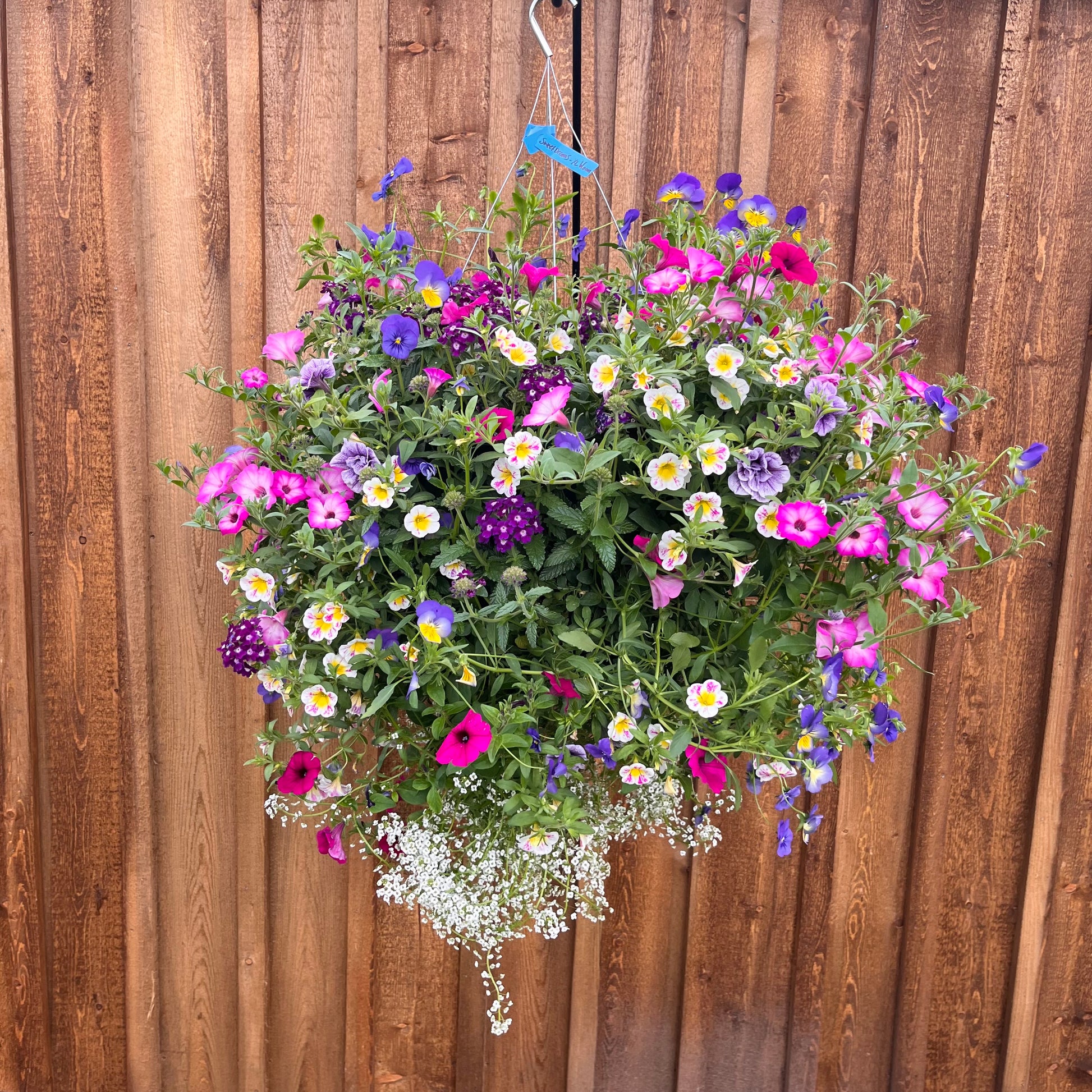 Full, beautiful hanging basket with trailing magenta petunias, lavender and pink calibrachoas, purple verbena, yellow and blue pansies and white lobularia. Full sun, medium maintenance, usually daily watering.