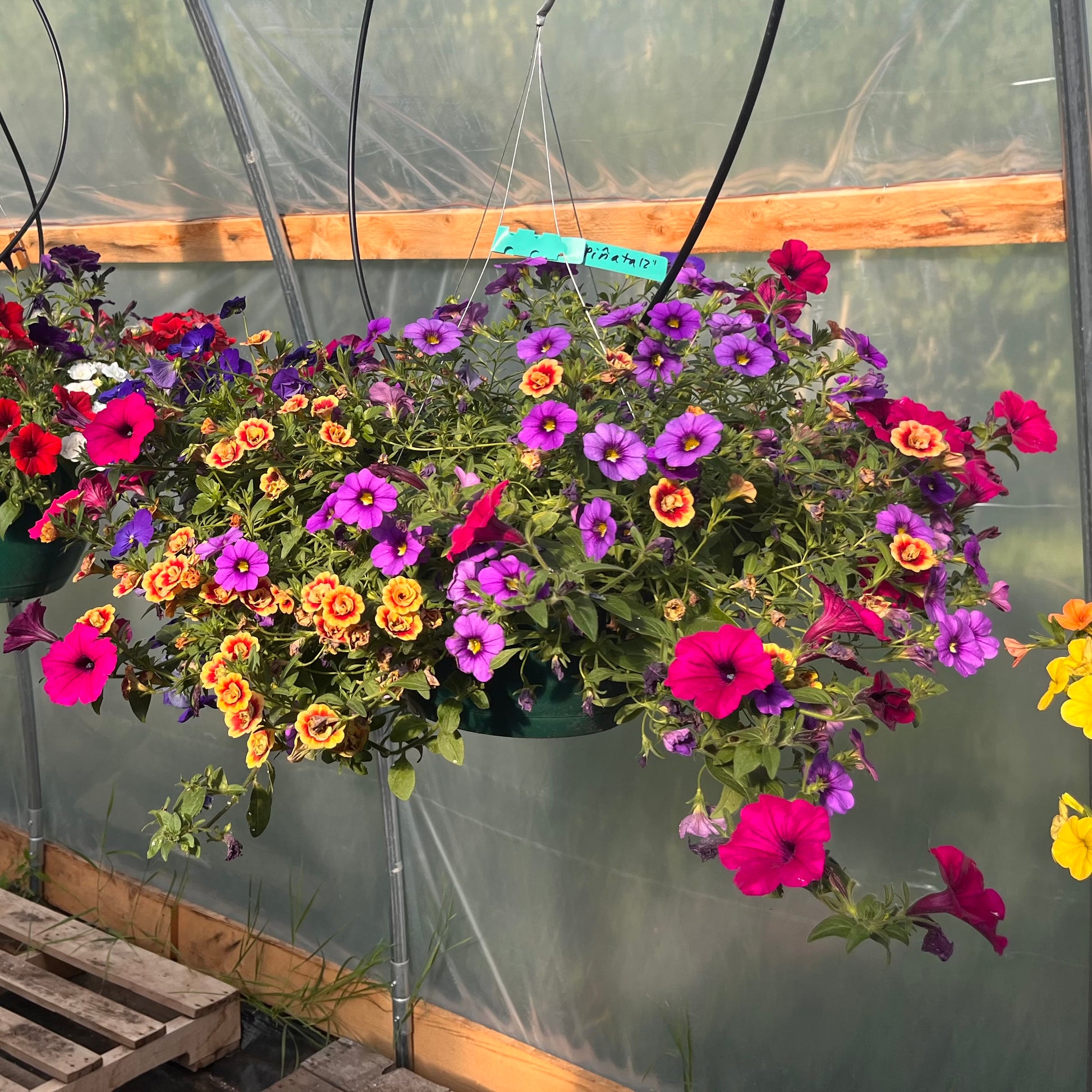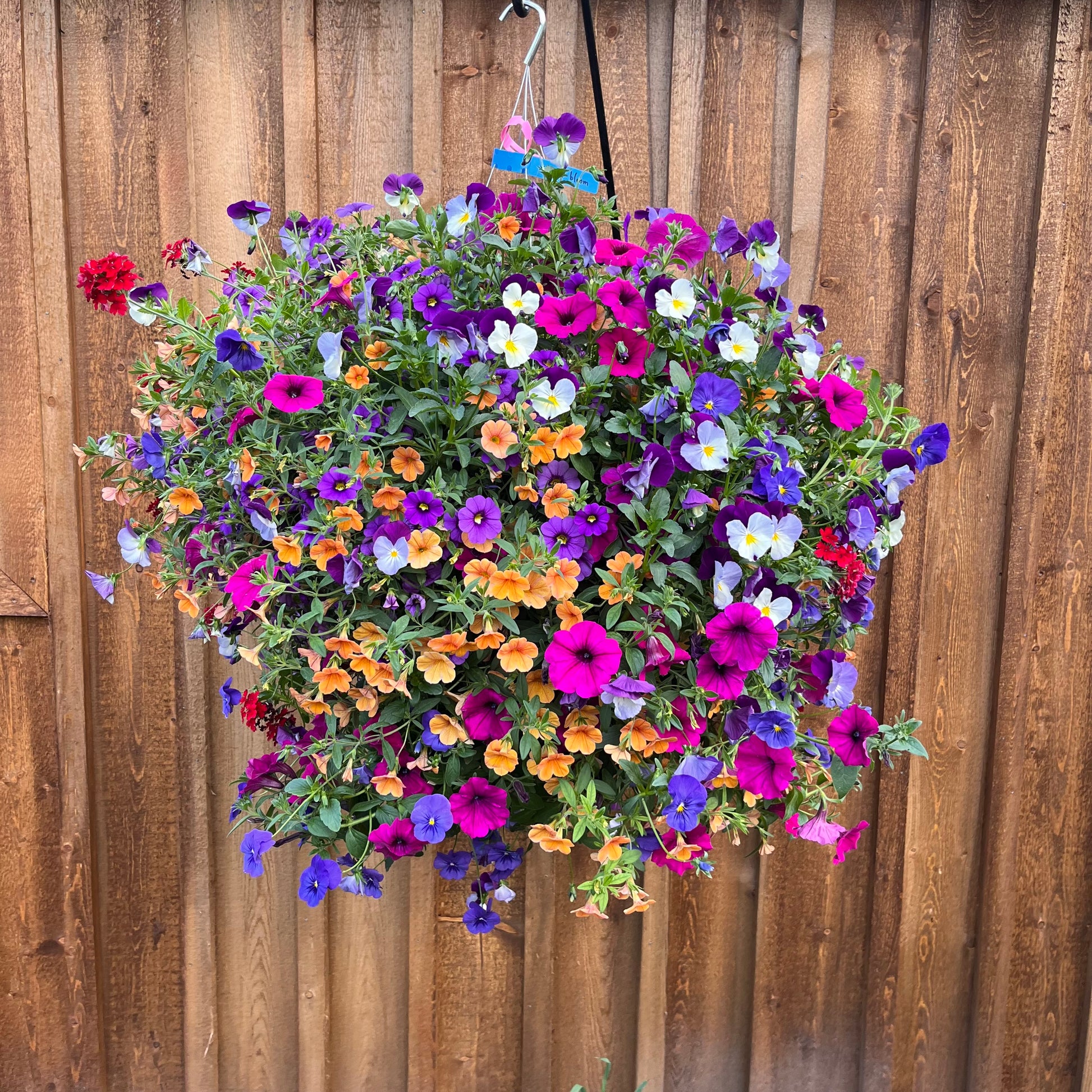 Full, beautiful hanging basket with trailing magenta petunias, orange and lavender calibrachoas, orange bidens, white and purple pansies. Full sun, medium maintenance, daily watering.